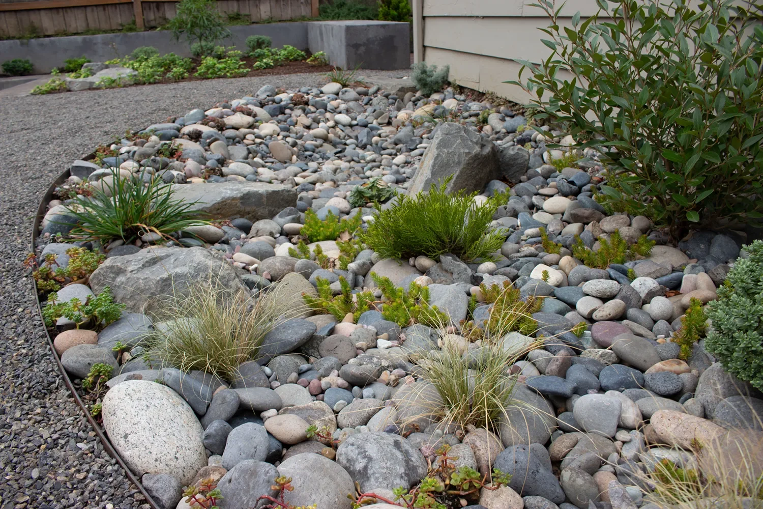 Instead of basic landscaping, we installed a beautifully designed rain garden. Not only does it absorb and filter rainwater runoff naturally, it also adds color and texture with a mix of native plants that bloom across the seasons. Functional and beautiful.