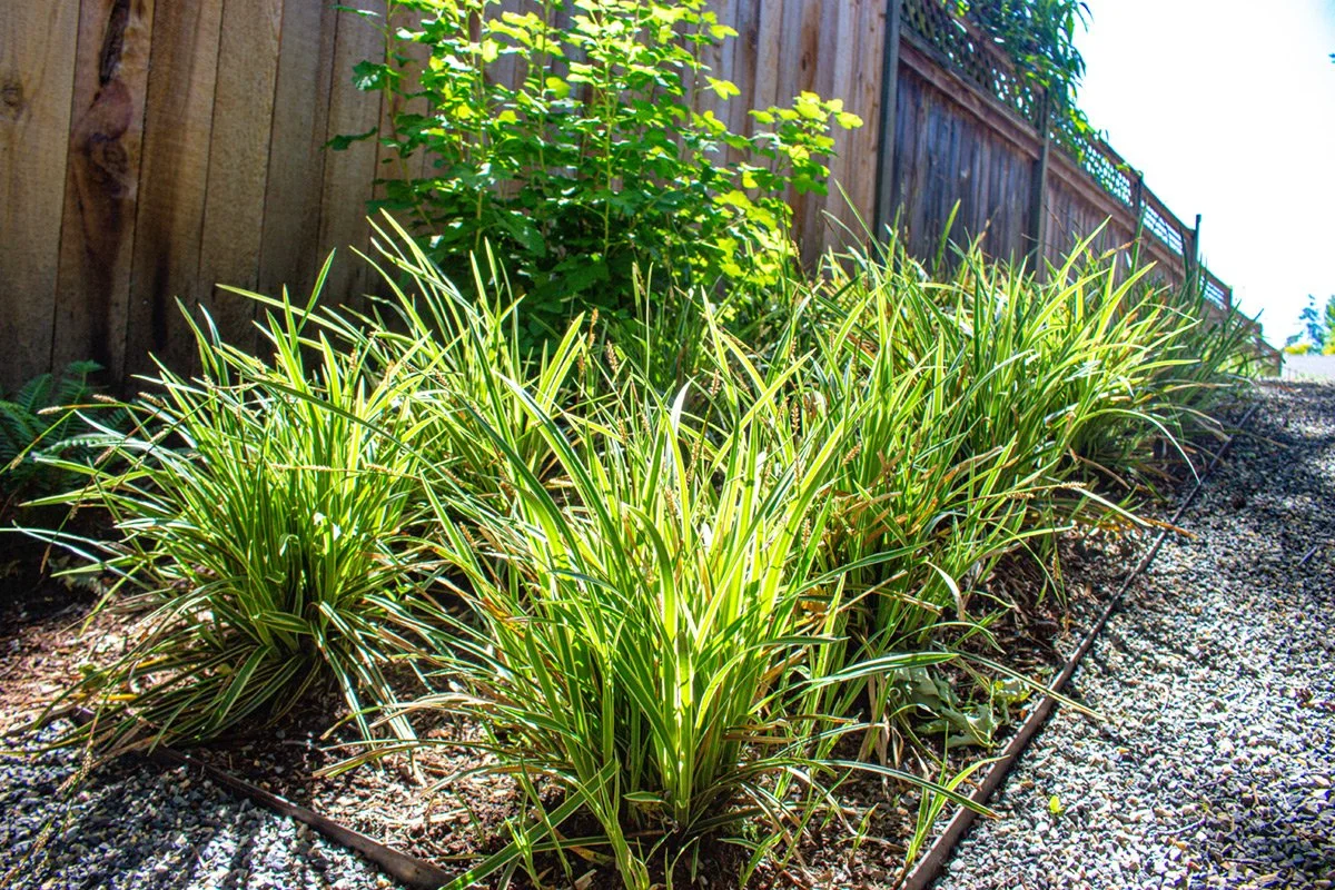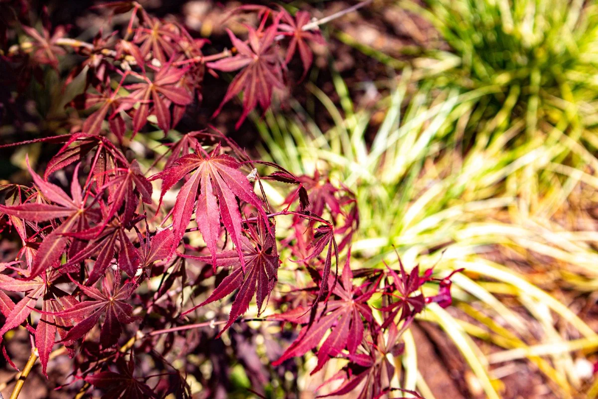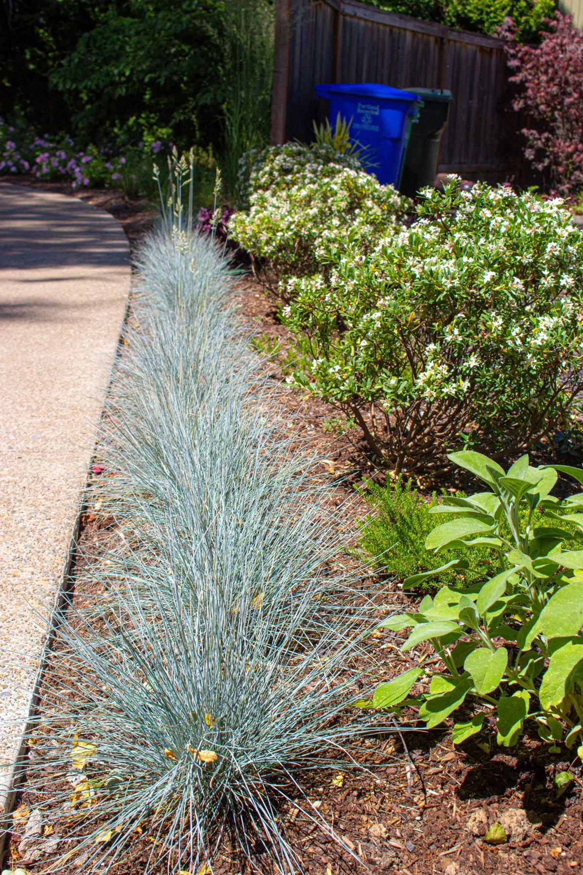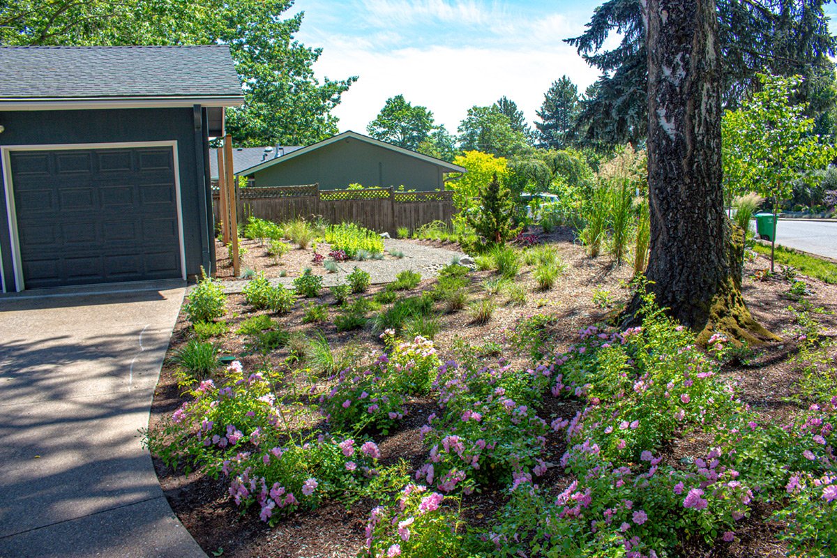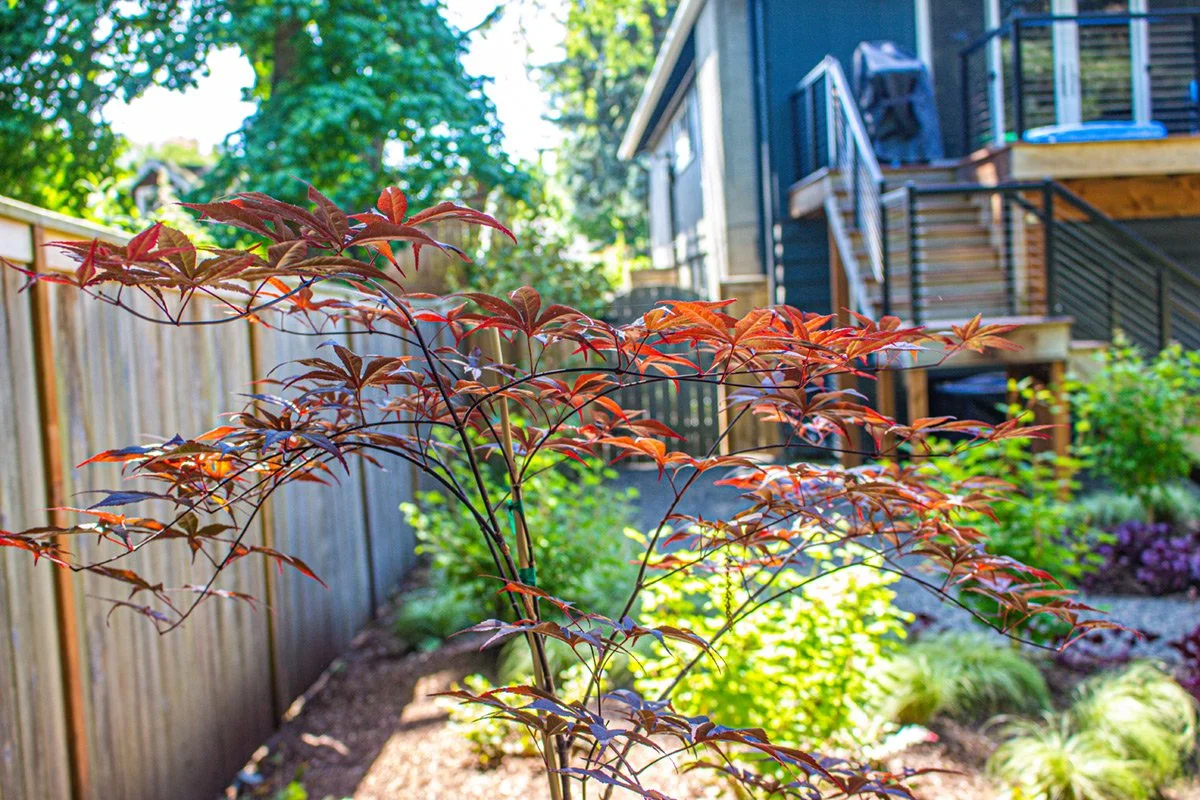 In the front yard, we introduced a planting palette using a mix of native and non-natives anchored by standout specimens like the Suminagashi Japanese Maple, Black Dragon Japanese Cedar and Red Flowering Currant. These selections offer year-round structure and seasonal interest without overwhelming the space with flowers or upkeep.