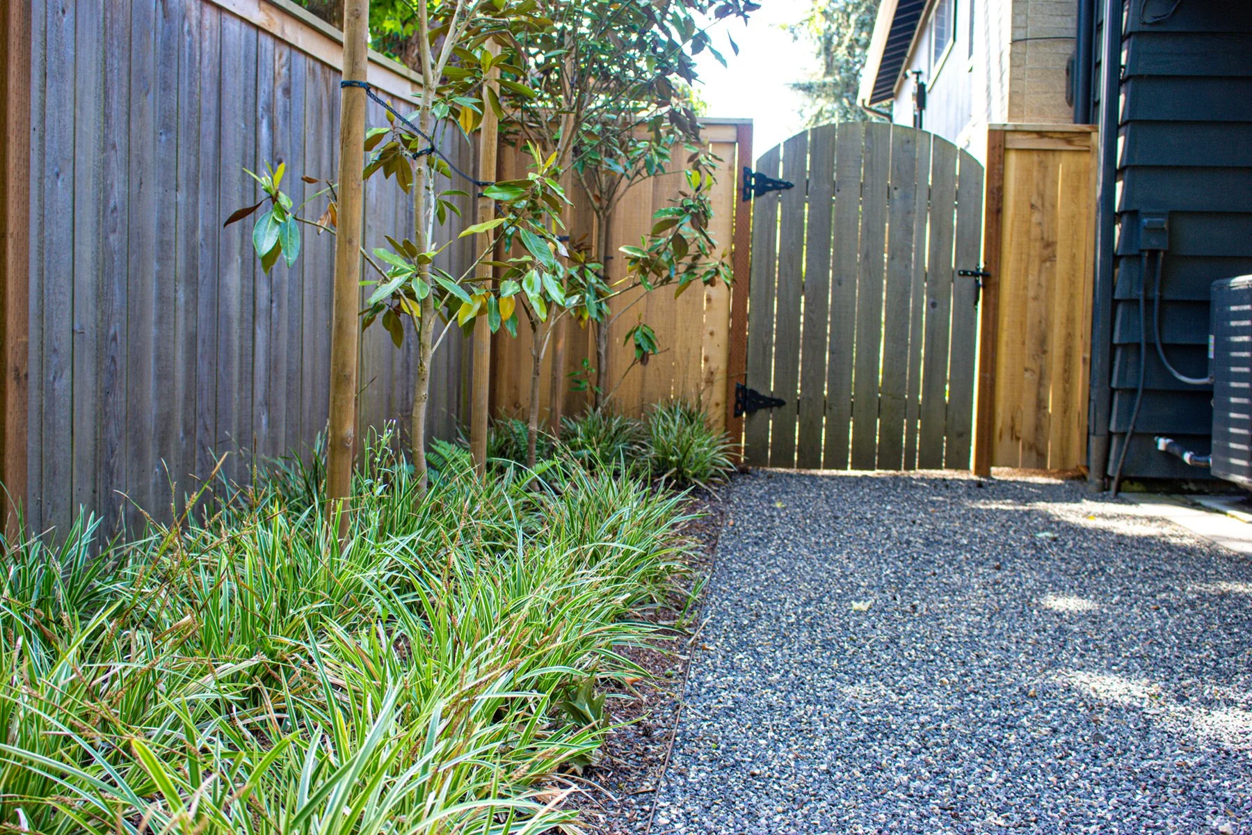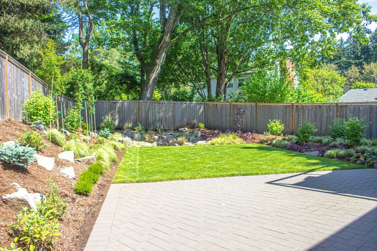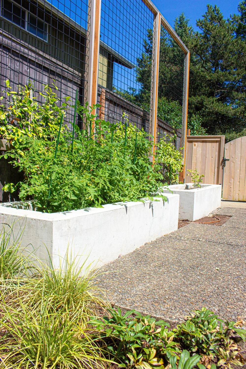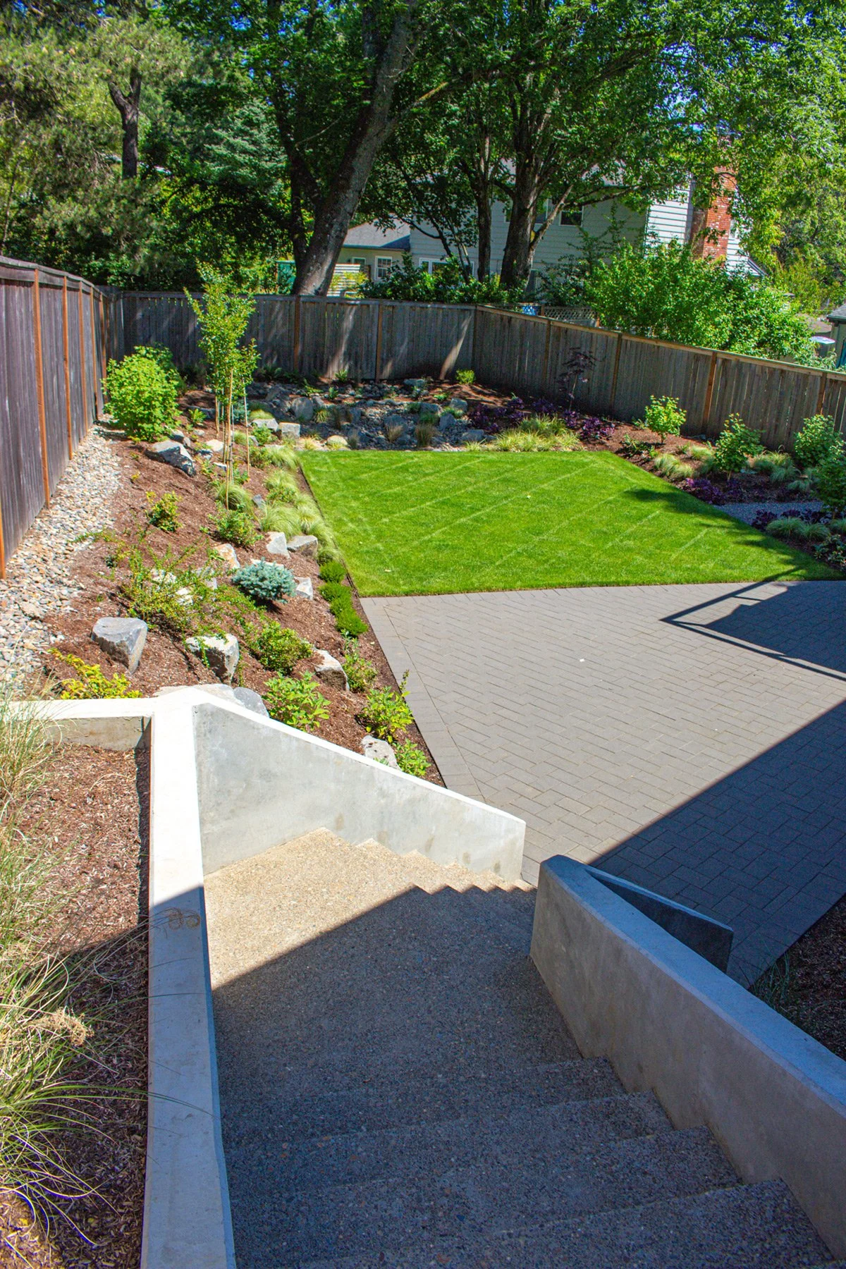 For the backyard, we installed a paver patio to create a welcoming area for entertaining and family time. To support sustainable outdoor living, we addressed drainage concerns, added efficient irrigation, incorporated raised beds and, a screening structure along the side yard for gardening.