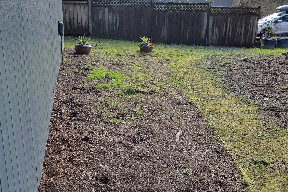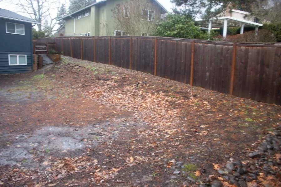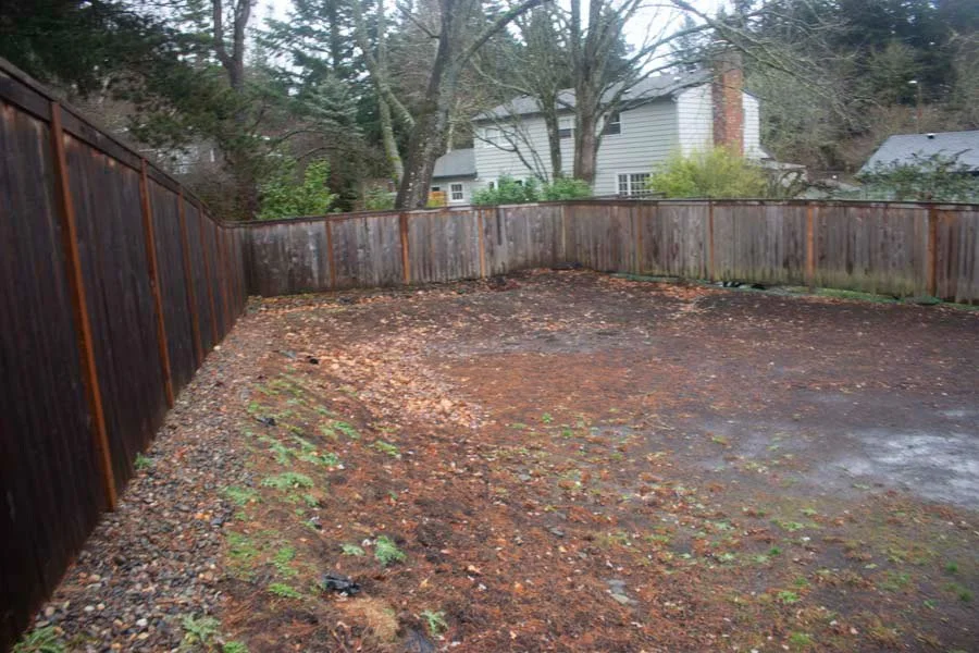The client came to us with a front and backyard in need of a transformation—both lacked irrigation, were overrun with weeds and grass all over, and had minimal plant life. The front yard featured a large empty space where a juniper was recently removed, while the backyard struggled with poor drainage from an old in ground pool and no functional layout. The client envisioned a natural, simple, and low-maintenance landscape that felt neat and inviting. Their goals included adding a patio with pavers for entertaining, creating a side-yard veggie garden with screening to the neighbors house, and designing a kid-friendly backyard. They requested native plants that would be low maintenance.